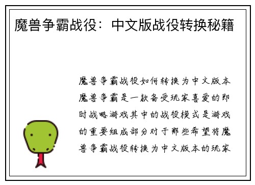 魔兽安装地图如何进 一、下载魔兽地图 在开始安装魔兽地图之前,首先需要下载所需的地图文件。魔兽地图可以从官方网站或者其他游戏资源网站上下载。在下载地图时,需要注意地图的版本和适用于的游戏版本,确保下载的地图与游戏版本相匹配。 二、解压地图文件 下载完成后,地图文件通常会以压缩文件的形式保存在计算机中...